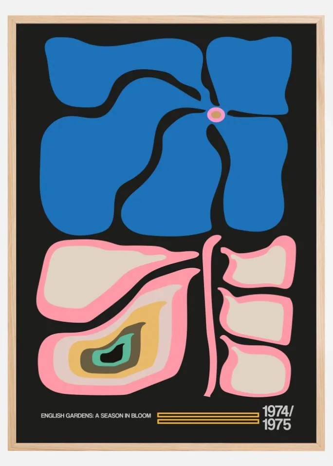 Denne kreative og farverige ‘English Gardens: A Season in Bloom’ plakat er en æstetisk hyldest til havens blomstrings mangfoldighed og pragt. Plakaten fanger øjet med dens stærke, blå blomst, der står i kontrast til en sort baggrund, kompletteret med accentfarver i lyserød, beige, og en antydning af grønt. Denne specielle kombination af farver tilbyder en dristig og nutidig fortolkning af en klassisk engelsk have i fuldt flor. Året ‘1974/1975’ tilføjer en historisk dimension, som måske antyder en betydningsfuld periode for haver eller kunst.