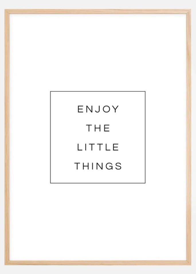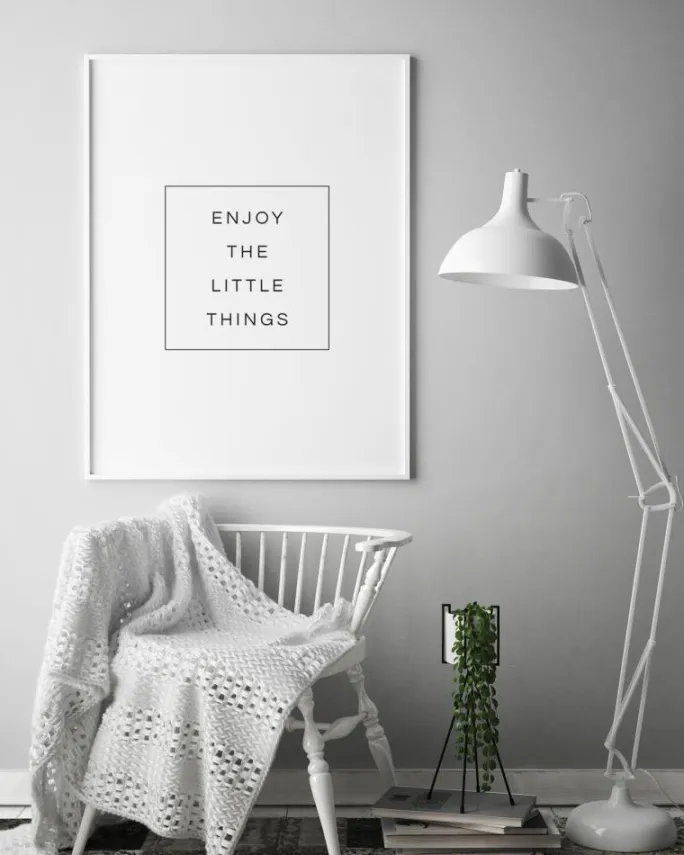 En motiverende plakat, der fortæller dig, hvordan du skal komme videre med din dag. Denne enkle hvide plakat fortæller dig, at du skal nyde de små ting, en god bekræftelse til hverdagen. Giv dig selv et boost hver morgen, når du drikker te foran dette print.