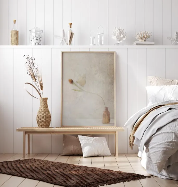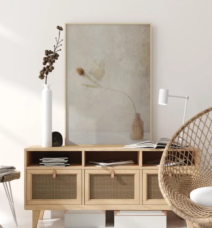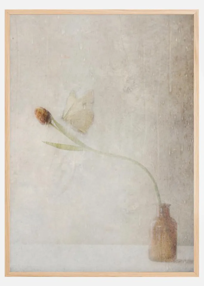 En blid plakat af en sommerfugl, der lander på en blomst. Dette subtile billede med brune toner tilføjer en varme til rummet. Sommerfuglen lander blødt på blomsten og bøjer den nedad, så den sidder i midten af værket. Vingerne smelter næsten ind i væggen bagved i dette flygtige møde.