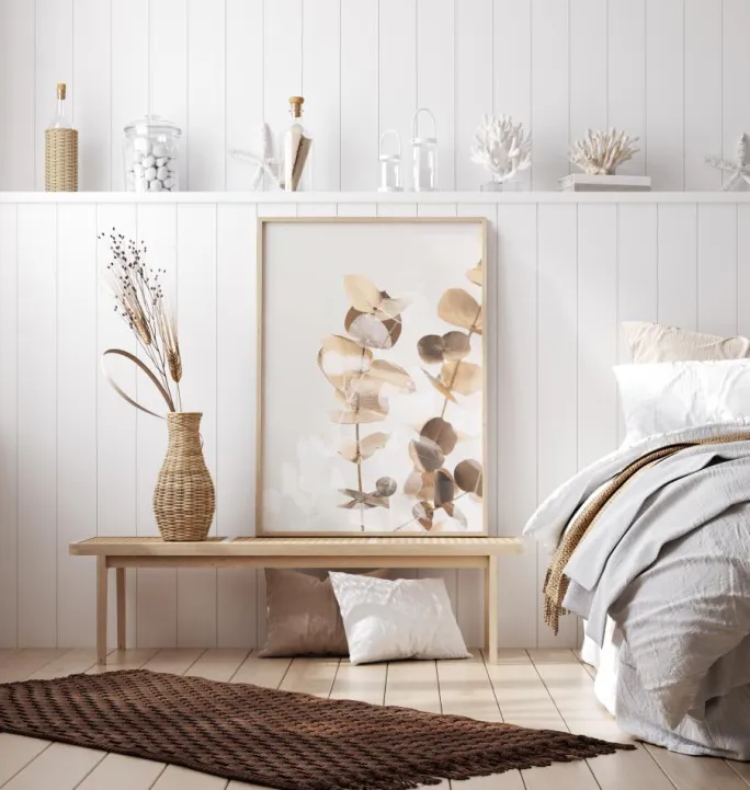 En gylden plakat med eukalyptusblade og -grene. De gyldne og brune blade står frem i skimrende form mod den enkle hvide baggrund. Hvis du vil gøre bladene stærkere, kan du matche dem med en lignende væg i guld eller mørk creme for at give dem ekstra elegance.