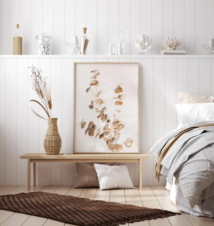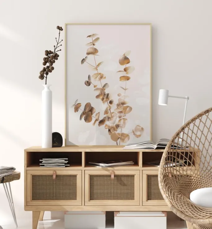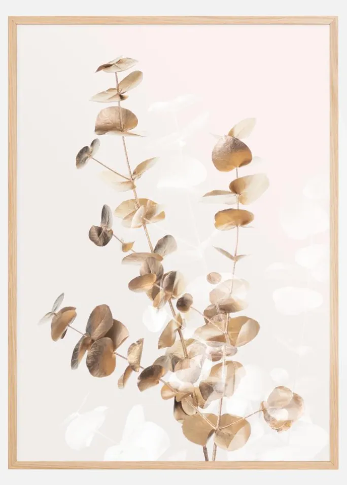 En dejlig plakat med kviste af gyldne eukalyptusgrene. De gyldne og brune blade er bløde, mens de skiller sig ud fra den hvide baggrund. Bladene er runde og skaber flotte former i billedet. Denne plakat giver en rolig, overskuelig stemning i dit hjem.