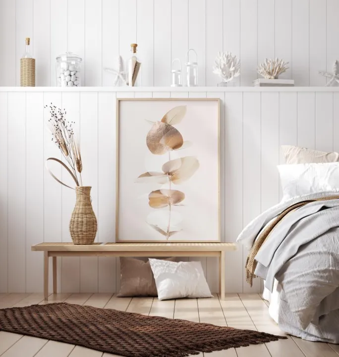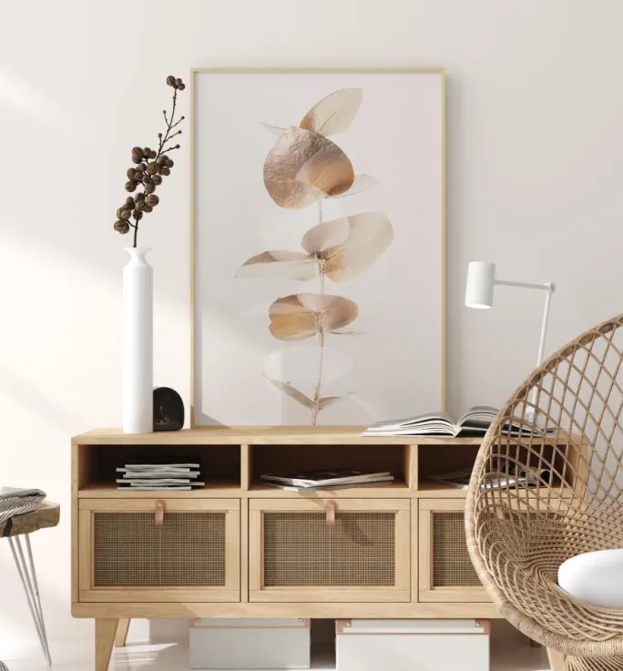 En nærbillede af nogle gyldne eukalyptusblade. Den enkle elegance i dette billede forstærkes af den hvide baggrund. De gyldne blade skinner blidt, mens de fylder plakaten med deres bløde glød og fremkalder en følelse af ro i hjemmet.