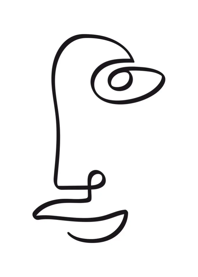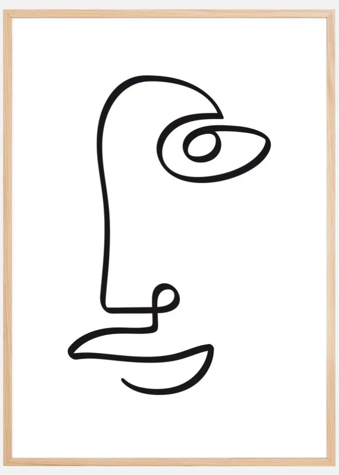 En abstrakt plakat af et ansigt med sorte linjer. Den enkle sorte streg snor sig rundt om værket for at skabe den ene side af et ansigt uden at forlade papiret. Overvej dette enkle billede, når du hænger det op derhjemme, og se endda andre billeder gemt indeni.