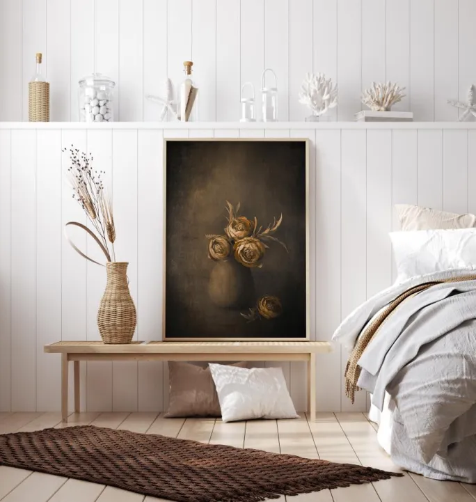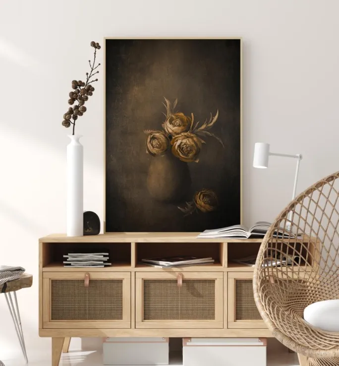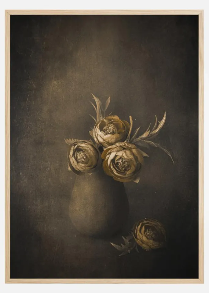 En stillebenplakat med gyldne blomster i en lerkrukke på en mørk baggrund. De guld og gule blomster, der skinner, skiller sig ud mod væggen på maleriets mørkere brune farve. Sæt dette sammen med en cremefarvet væg for at hjælpe med at løfte disse blomster til det næste niveau.