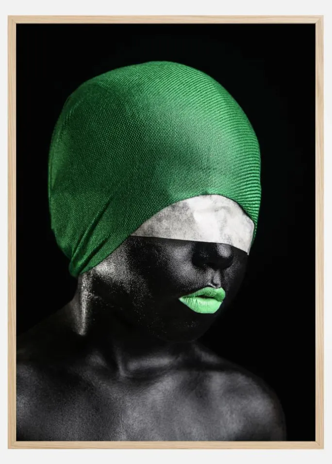 En portrætplakat af en stærk sort kvinde hendes hoved er dækket af et grønt tørklæde. Hun bærer en fed grøn læbestift, der matcher tørklædet for et spektakulært look. Selv om det er fedt, er der en vis mystik, da hendes øjne er dækket.