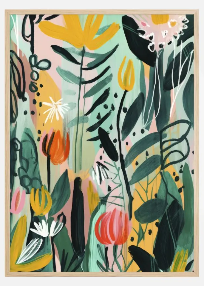 Denne levende og nutidige plakat fanger essensen af en blomstereng med et moderne twist. En frodig komposition af stiliserede blomster og blade, fremstillet i dristige penselstrøg og legende farveblokke. Nuancer af gul, orange, pink og forskellige grønne toner blander sig med sorte konturer for at skabe et dristigt og forfriskende kunstværk, der straks fanger øjet. Det er en hyldest til naturens amorfe skønhed, omformet i en moderne kunstners farverige palet.