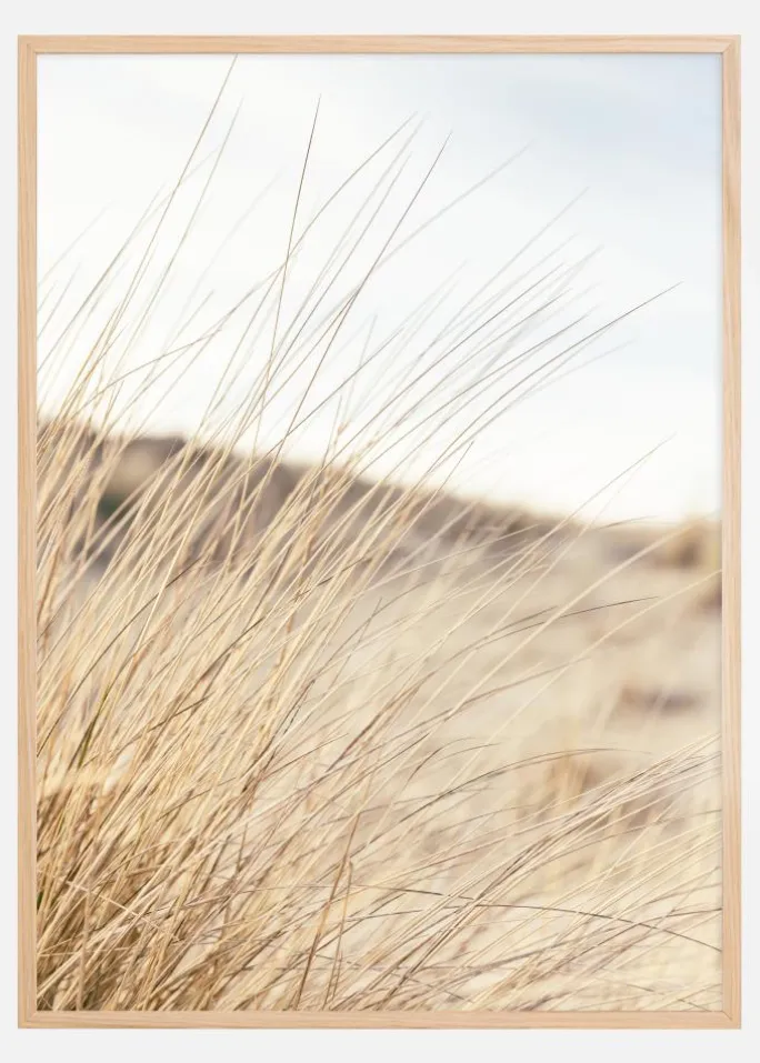 Denne plakat afbilder det bløde og stille landskab i en mark af tørt græs, hvor dens naturlige nuancer af beige og brunt blander sig mod en diffus baggrund af bløde lyse toner. Den beroligende og naturinspirerede komposition inviterer til refleksion og har en afslappende effekt, hvilket gør den ideel til rum, der er beregnet til afslapning og genopretning.