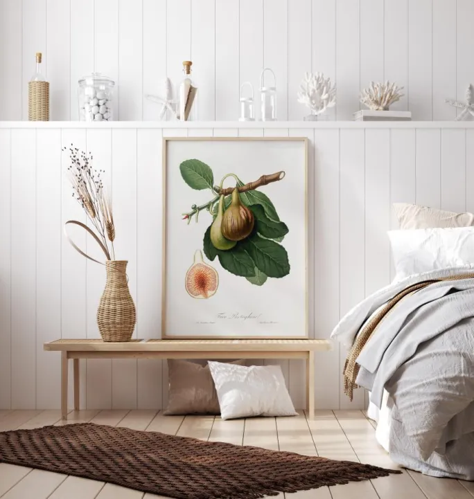En botanisk plakat af en illustration af figner. Gå gammeldags til værks, når du hænger denne enkle, men detaljerede tegning op på din væg. Akvarelmaleriet fanger alle detaljerne og giver dig endda et tværsnit af figen og frøene indeni.