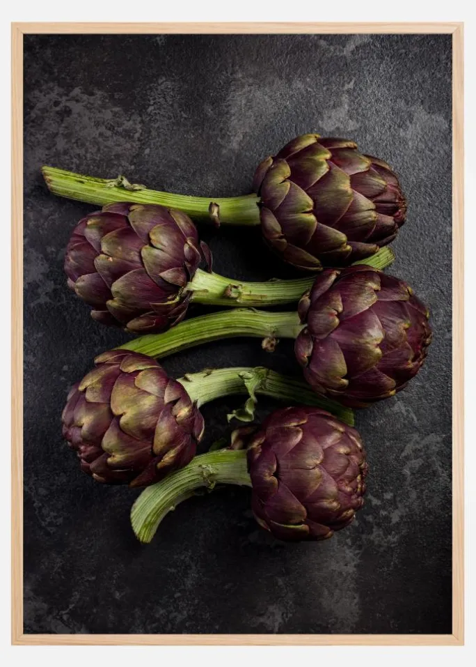 Denne rustikke og naturinspirerede plakat skildrer fem nuancerede artiskokker mod en mørk, tekstureret baggrund. Det nærgående foto fremhæver de dybgrønne og purpurrøde nuancer i artiskokkens blade, og det jordnære motiv ville passe godt i et køkken eller spisestue, hvor det kan inspirere til kulinariske eventyr. Denne print er ikke kun en hyldest til naturens skønhed, men også en påmindelse om den friske mads evne til at samle mennesker.
