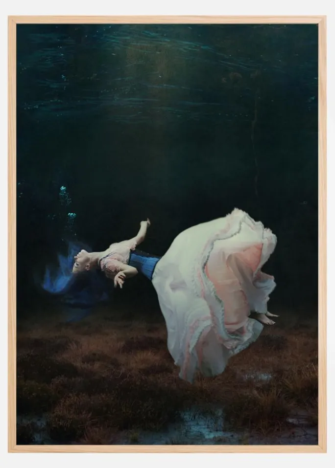 En fantasiplakat med en kvinde på ryggen, der flyder ned på bunden af noget vand. Hendes blå hår hvirvler op, mens hendes hvide nederdel bølger ud i vandet. Bobler dukker op, og et rødt plantebed venter på hende, når hun falder. Slap af og slip dine bekymringer i denne enkle, men befriende plakat.