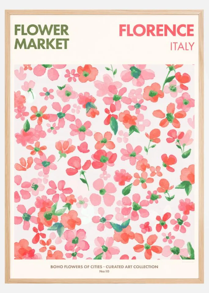 Indkapsl essensen af en blomstrende italiensk by med denne smukke plakat fra vores ‘BOHO Flowers of Cities’ – Kurateret Kunstsamling. Denne plakat er en hyldest til Firenze og viser en mark med vandfarvemalede blomster i varierende nuancer af lyserød og rød, hvilket leder tankerne hen på de livlige blomstermarkeder i hjertet af Italien. Dette delikat udførte kunstværk er perfekt til at indføre en følelse af Firenzes romantik og skønhed i ethvert rum.