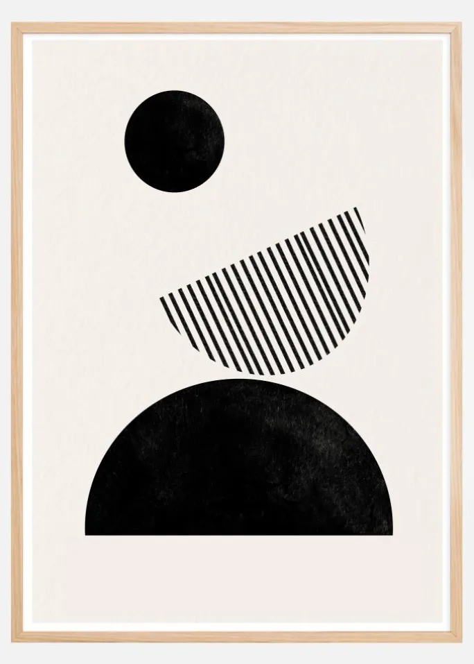 Denne kunstneriske plakat kendetegnes ved sin legende anvendelse af geometriske former og teksturer for at skabe en balanceret og moderne komposition. En stor sort cirkel sidder øverst, efterfulgt af en diagonalt riflede halvcirkel og en solid sort halvcirkelform ved basen. Hvert element bidrager til en følelse af bevægelse og dynamik, mens den ensartede farvesætning skaber en følelse af sammenhæng og enkelhed.