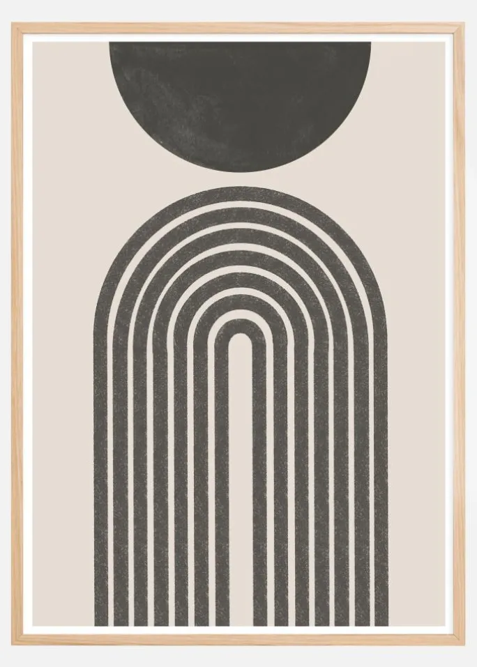 Denne kunstneriske plakat viser en sammensmeltning af geometrisk præcision og organisk blødhed. Den øverste del af designet består af en sort halvcirkel, der stråler en beroligende tilstedeværelse mod den varme, neutrale baggrund. Under dette rejser en række sorte buer sig, som harmonisk danner en portallignende form, hvilket skaber en kontrast mellem den strenge geometri og den sorte cirkels abstrakte kurver. Den enkle farvesætning med sort mod en off-white baggrund giver et moderne og elegant indtryk, perfekt til det nutidige hjem eller kontor.