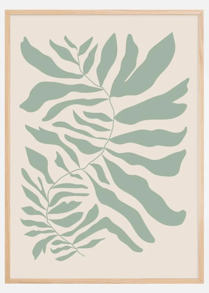 Med sit friske og rene design tilbyder denne plakat en afbildning af grønne planteblade mod en beroligende beige baggrund. Dens organiske linjer og naturlige former bringer naturens beroligende tilstedeværelse direkte ind i din stue eller arbejdsplads. Farvepaletten bruger forskellige grønne nuancer, fra lysere blade til mørkere konturer, hvilket giver en dynamisk men harmonisk følelse. Dette print er en hyldest til naturens enkle skønhed og kan tilføre et fredfyldt element til enhver indretningsstil.