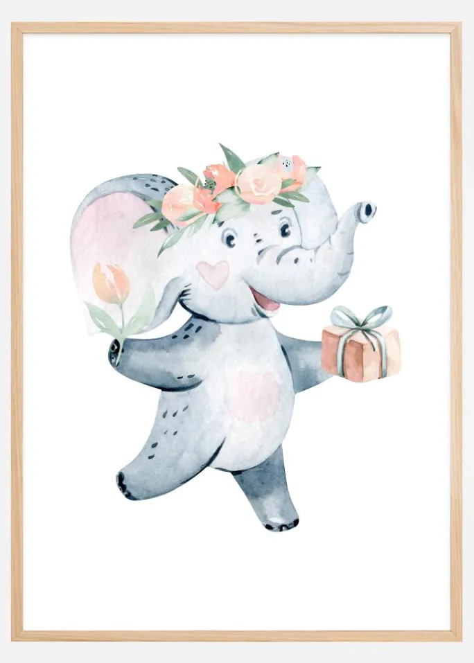Løft stemningen i ethvert rum med denne bedårende elefantplakat, som udstråler glæde og uskyld. Her ses en charmerende grå lille elefant, der tripper let, parret med en blomsterkrans af rosa og fersken farver på hovedet. Dyrets udtryk er fyldt med venlighed og lykke, og den holder i en omhyggeligt indpakket gave, hvilket giver en ekstra touch af glæde og generøsitet til scenen.