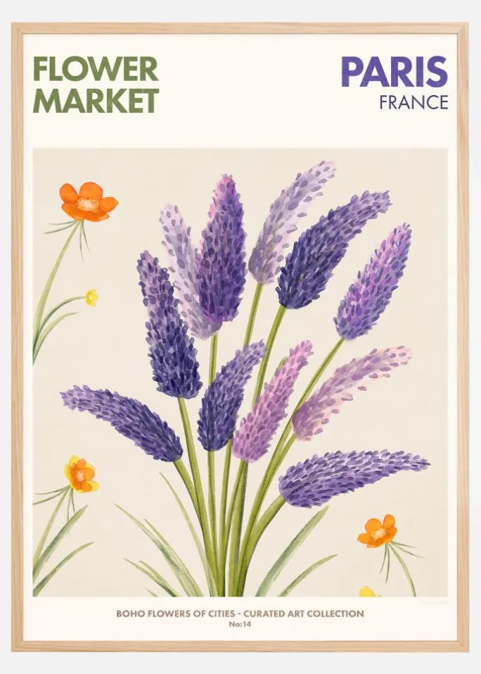Oplev charmen og elegancen i Paris gennem denne smukke plakat, som er en del af vores ‘BOHO Flowers of Cities’ – Curated Art Collection. Denne kunstneriske fremstilling af dejlige lavendel og livlig orangerød valmue fanger den ikoniske blomsterpragt, man kan opleve på byens blomstermarkeder. Perfekt til dem, der ønsker at bringe en del af byens romantiske atmosfære ind i deres hjem, giver denne plakat en fransk flair, der er både klassisk og tidløs.