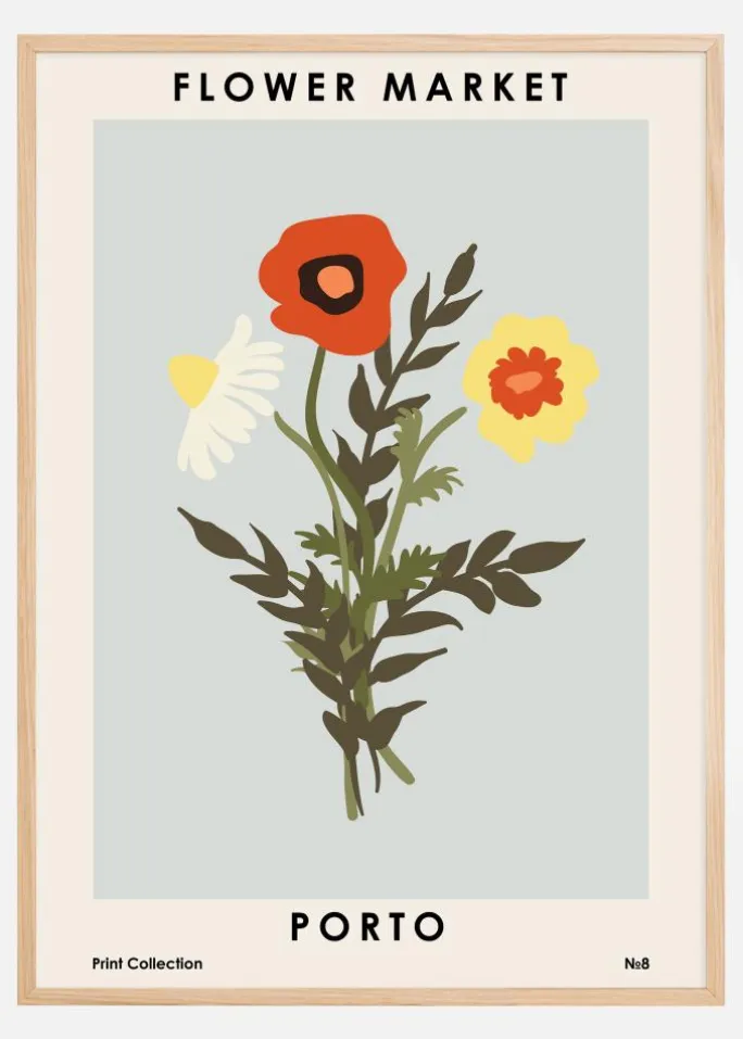 Illustreret med en enkel og elegant følelse, fanger denne plakat blomstermarkedets livlige atmosfære i Porto. I centrum af designen står en trio af blomster i iøjnefaldende farver: en dyb rød, en strålende gul og en blød hvid, som alle hviler mod en blød blågrå baggrund. Den afbalancerede farvesætning tilføjer et sofistikeret og samtidig jordnært touch, hvilket gør denne print ideel for at invitere naturens skønhed og Portos karakter ind i dit hjem eller kontor.