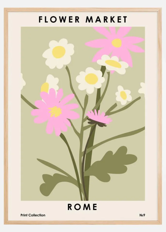 Med et lyst og indbydende design, afbilder denne plakat den varme og livlige atmosfære på et blomstermarked i Rom. Detaljerigdom og en legende brug af farver er i fokus, med store lyserøde blomster, der komplementeres af delikate hvide blomster, alle mod en baggrund i en beroligende olivengrøn tone. Dette print er perfekt til at indføre en følelse af Roms evige by og dens kærlighed til skønhed og naturen i dit rum.