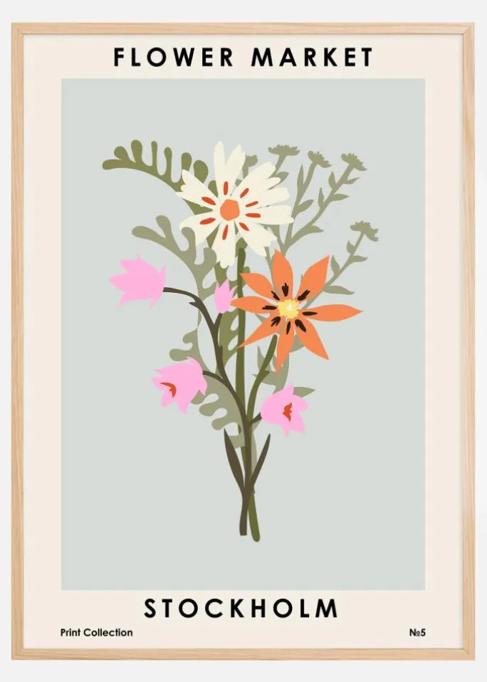 Denne plakat giver et billede af Stockholms blomstermarked, med et friskt og naturinspireret design, der fanger byens pulserende skønhed og frodighed. I dette print harmoniserer lysets spil mellem blomsterne og løv, hvilket giver liv til de blomstrende motiver, der er illustreret i nuancer af hvid, rosa og orange mod en mild blågrå baggrund. Det er en hyldest til den skandinaviske hovedstads kærlighed til naturen og dens evne til at blande tradition med moderne design.