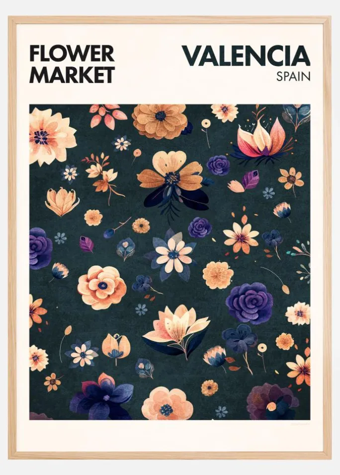 Denne farverige og livlige plakat afbilder blomsterprakten fra Valencias blomstermarked i Spanien. Det detaljerede motiv er en hyldest til markedets mangfoldighed af blomster, hvor hver sort og farve synes at være fanget i fuldt flor. Fra de delikate pasteller til de dristige, mættede farver, fanger designet følelsen af en frodig oase midt i byens hjerte.