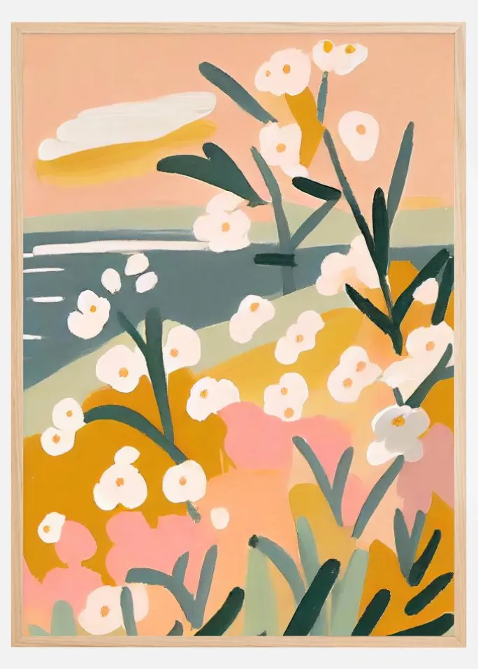 Denne farverige og livlige poster afbilder en buket af hvide blomster mod en baggrund af varme hav- og sandtoner, og giver følelsen af en blomstrende have ved havkanten. De stiliserede blomsterblade og de bløde kurver af løv er fremhævet mod skiftende nuancer af lyserød, gul og blå, hvilket giver en legende, men alligevel sofistikeret æstetik. Dette kunstværk er et fremragende supplement i ethvert rum, der ville have gavn af en lys og glad atmosfære.