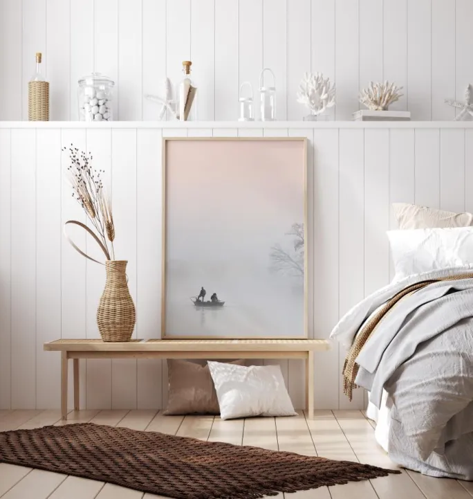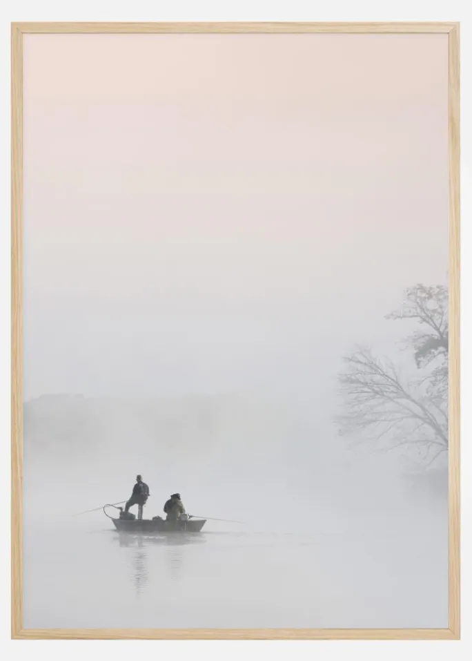 En magisk plakat af to mænd, der fisker i en båd en tåget morgen. Den lille båd ligger til venstre i silhuet. Trægrene kan ses til højre, men alt er indhyllet i et kraftigt tæppe af hvid tåge, hvilket gør dette til et mere magisk billede. Nyd freden tidligt om morgenen med denne plakat.