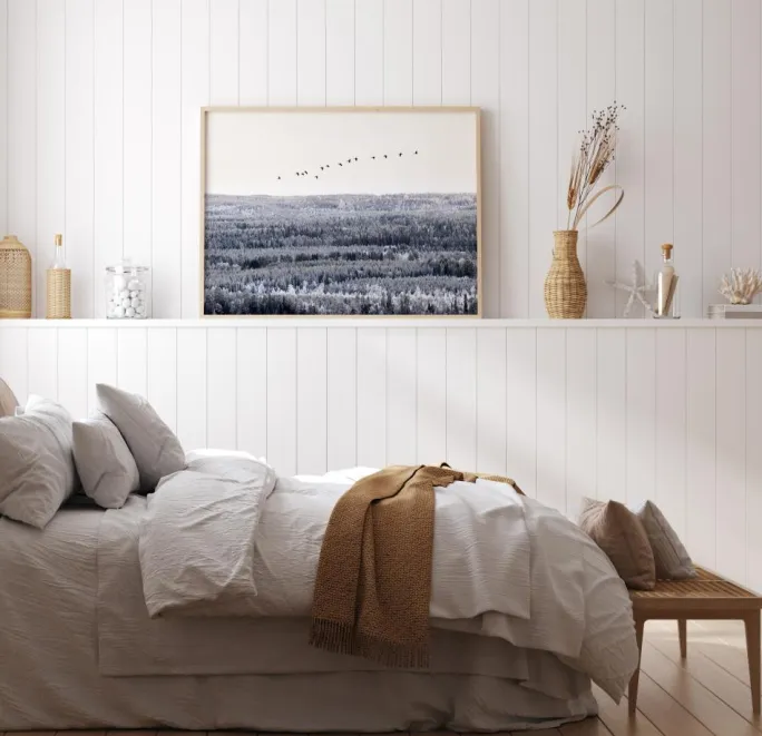En fotografisk plakat over en flok med trækfugle, der flyver højt over trætoppene. Den vidstrakte skov går i kølige farvetoner under en hvid himmel. En plakat, der ånder en herlig følelse af frihed.
