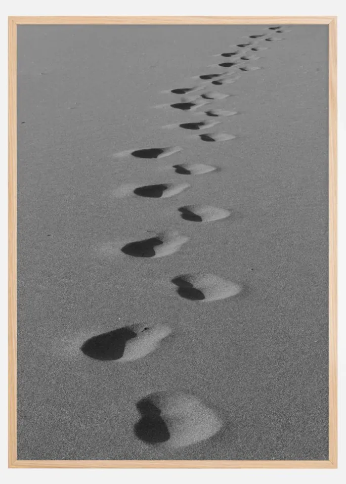 Denne tankevækkende plakat præsenterer en serie fodspor i sanden, hvilket fører øjet på en vandring mod det ukendte. Den sort-hvide komposition tilbyder en klassisk og tidløs følelse, mens sporene i sanden symboliserer en rejse, både bogstavelig og metaforisk. Det er et billede, der inviterer til refleksion over de veje, vi tager, og de spor, vi efterlader os.