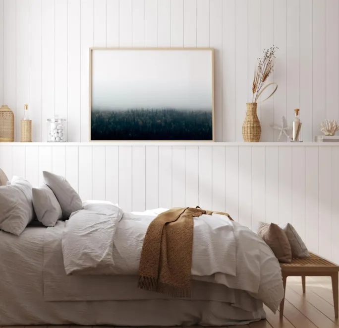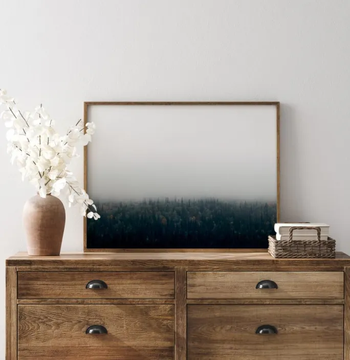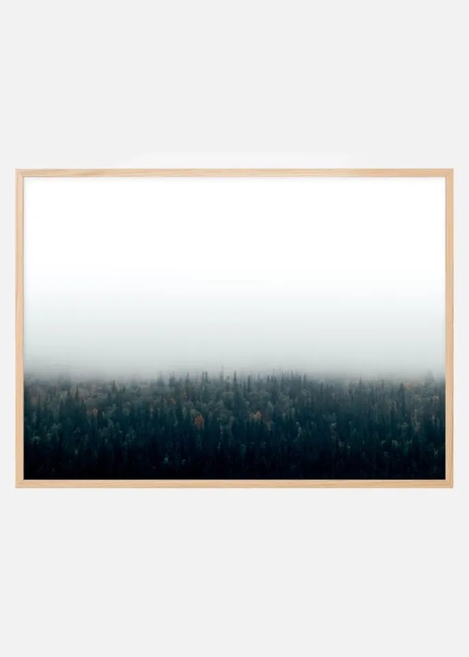 En fotografisk plakat over en vidstrakt skov, der hviler under tæt tåge. De grønne træer kontrasterer skarpt mod den hvide himmel. En smuk natur-nær plakat, der er let at kombinere med andre favoritter. Hvorfor ikke lave en større billedvæg med temaet natur?