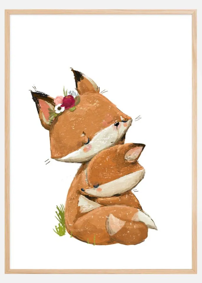 Omdefinér følelsen af ømhed med denne smukke plakat, der viser en moder ræv, der krammer sit unge barn i en øm omfavnelse. De varme toner af rævens pels sammen med de delikate blomster placeret på hovedet skaber et billede, der er både hjerteligt og æstetisk tiltalende. Denne illustration fanger essensen af moderlig kærlighed og det specielle bånd mellem forælder og barn.