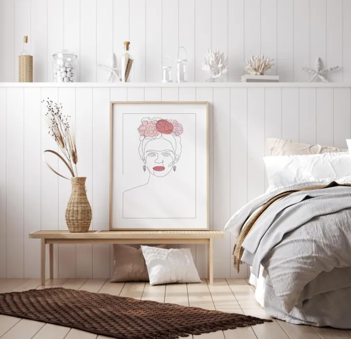 En abstrakt portrætplakat af Frida Kahlo med blomster i sit hår. En simpel stregtegning af Frida fanger øjeblikkeligt hendes essens, da hun dristigt stirrer ud af maleriet. De eneste farvepletter er hendes læber og blomsterhovedpynten i hendes hår. Sammensæt disse farver på den væg, hvor du hænger hende op.