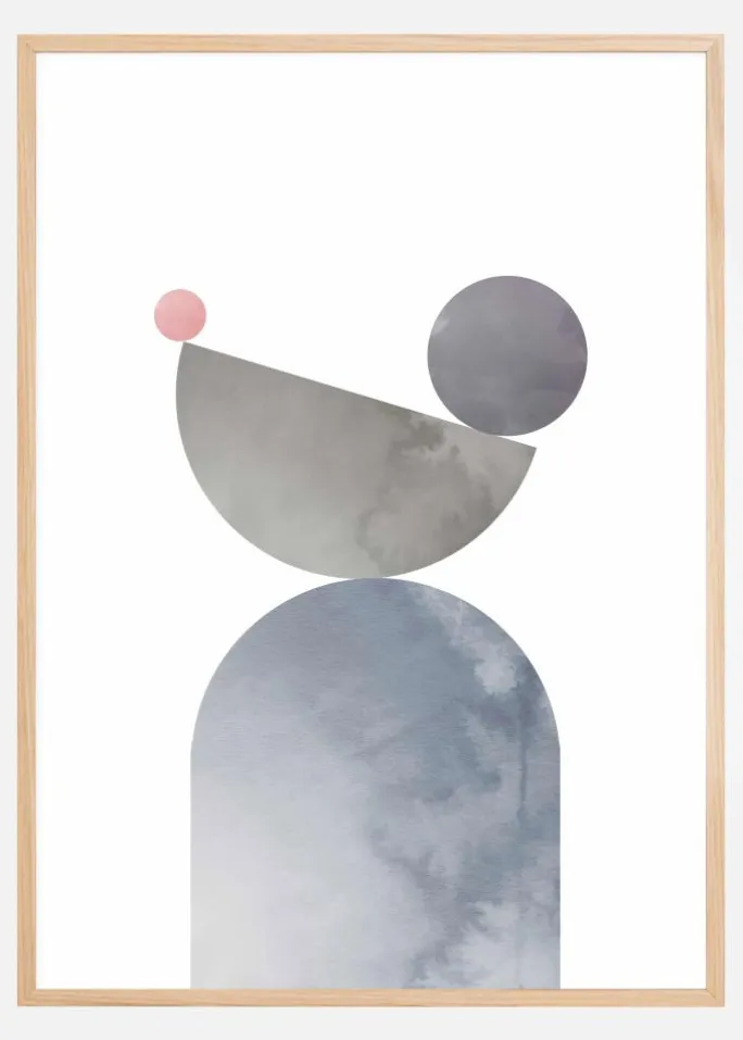 En abstrakt plakat med geometriske former og cirkler. En stor blå skyfyldt form sidder i bunden. Øverst balancerer en grå halvcirkel med en lille lyserød cirkel i den ene ende og en stor blå cirkel i den anden ende. Man kan bruge timer på at forundres over balancen i dette billede.