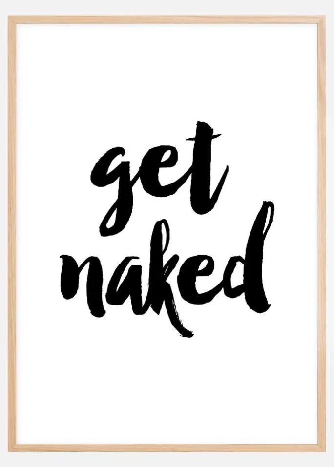 Hvem har ikke på et tidspunkt drømt om at leve livet som nudist? Denne herlige plakat opfordrer klart og tydeligt omgivelserne til at klæde sig nøgen. Prints er hvid med et sort tryk i form af teksten ”Get Naked”. Hæng den hvor som helst, men tænk på, at den opfattes forskelligt afhængigt af placering. I kaffestuen på arbejdet tages den nok mest for sjov, mens den kan have en helt anden betydning, hvis den hænges over sengen. Komplementér med en farverig ramme for en legesyg fornemmelse. Vil du give den endnu mere klasse, kombinerer du med en tjusig passepartout. Vælg mellem hele 6 forskellige formater!