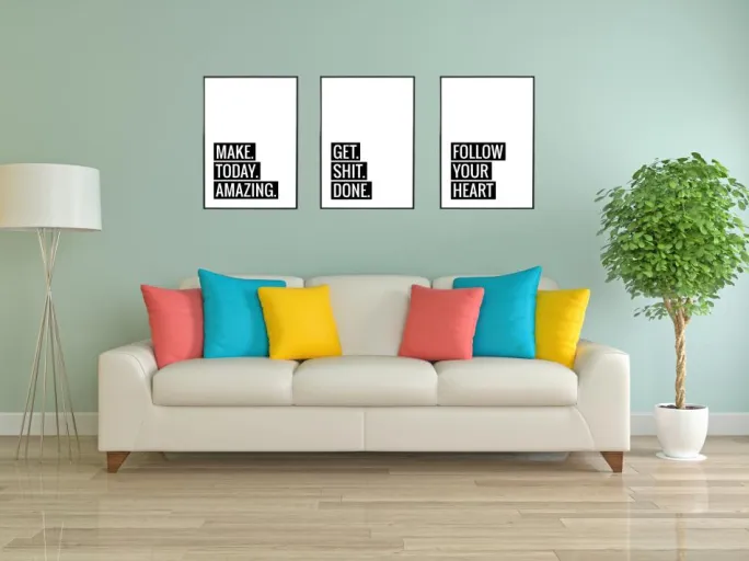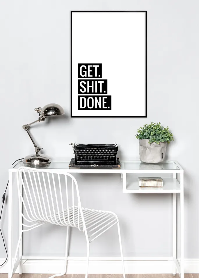 Dekorer væggene med direkte og friske opfordringer! Denne stilfulde plakat er i hvidt og har et sort og hvidt tryk med teksten ”GET. SHIT. DONE”. Det burde ikke være sværere end det! Det enkle design kan med fordel kombineres med dine favoritfarver på ramme, passepartout og diverse indretningskomponenter. Stil den på skrivebordet eller hæng den over sofaen! Eftersom plakaten findes i 6 forskellige formater, kan den passe ind, hvor end du ønsker den.