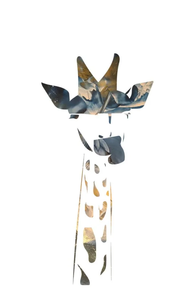 En sød udklippet plakat af en giraf. Designet af giraffen er skabt ved hjælp af udklippede figurer i forskellige farver. Her er der pastelfarver for at skabe en blødere giraf, som ser godt ud, når den sættes ind på en væg i pastelfarver.