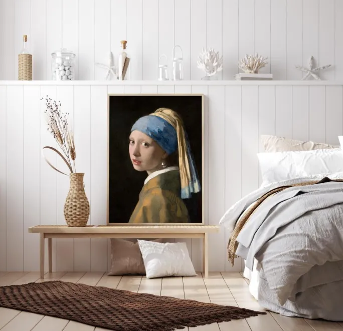 En plakat med et print af Girl With the Pearl Earring. Denne fantastiske pige ser lige ud til beskueren. Hendes ene perleørering er i fokus, mens hendes blå hovedtørklæde flyder ned bag hende. Nyd dette mesterværk selv derhjemme.