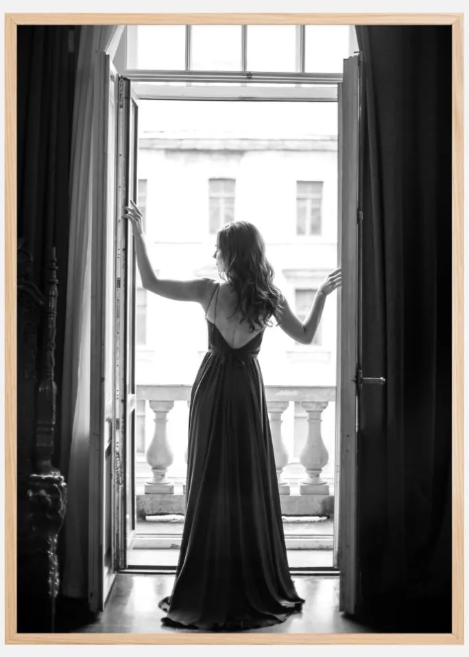 Et sort-hvidt fotografi af en kvinde i lang kjole stående ved vidt åbne altandøre, kiggende ud mod dagen. Foran hende anes slidte betonpiller og en slidt gammel facade. En plakat der ånder en skøn blanding af det smukke og levende i kontrast til det gamle og vejrbidte.