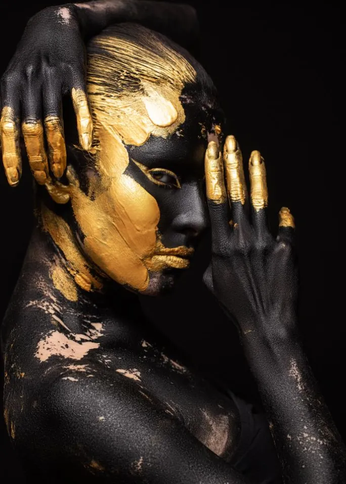En glødende portrætplakat af en kvinde i profil med den ene hånd holdt for ansigtet og den anden hånd draperet over hovedet. Kvinden er malet i sort og guld for at give en glødende effekt og få forskellige dele af hende til at skille sig ud, mens hun stirrer på dig fra øjenkrogen.