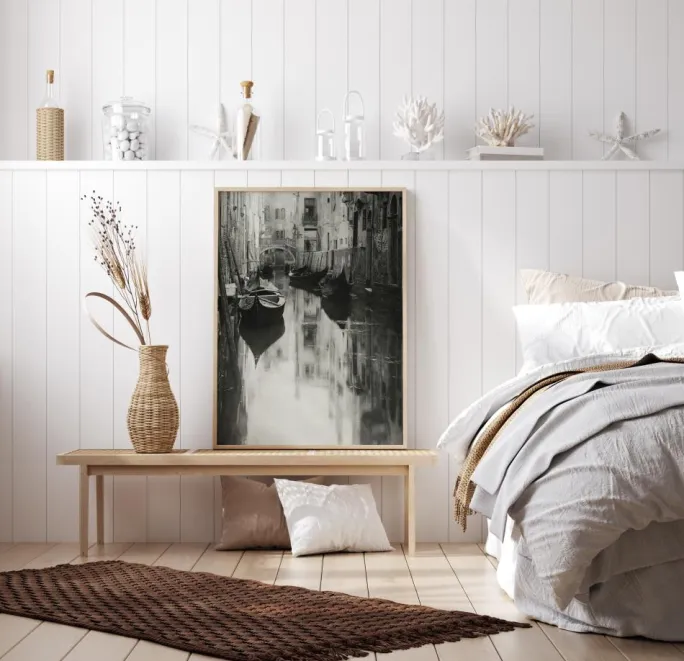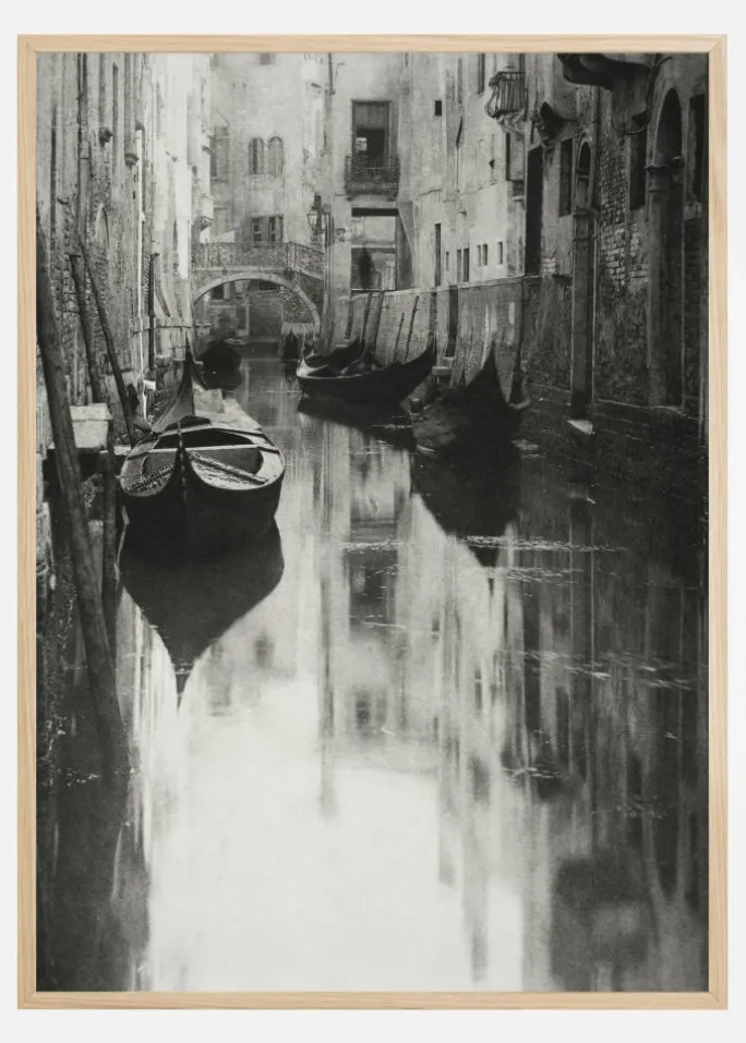 En sort/hvid plakat af gondoler fortøjet på en kanal i Venedig. Bådene ligger stille på det stille vand ved siden af husenes stejle sider. Billedet oser af fred og ro i dette afsidesliggende hjørne af byen.