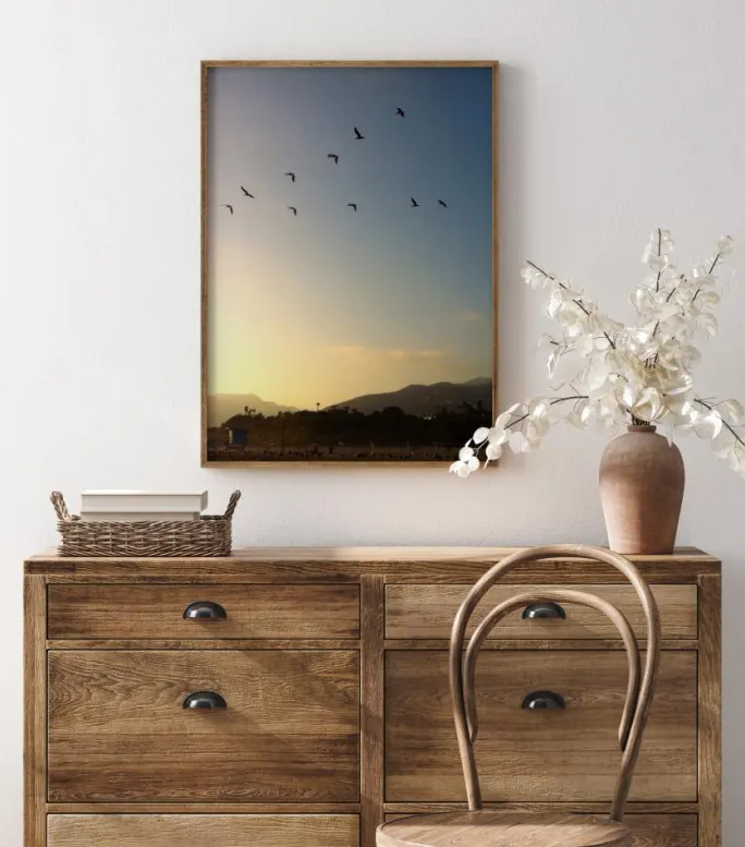 En opløftende plakat af en flok fugle, der flyver af sted, mens solen står op. Et simpelt gårdlandskab fylder bunden af billedet, mens den store blå himmel breder sig ud over det. En V-formet fugleflok bevæger sig mod venstre ind i morgenens bløde gyldne skær. Flyv væk med dine tanker med dette bevægende print.