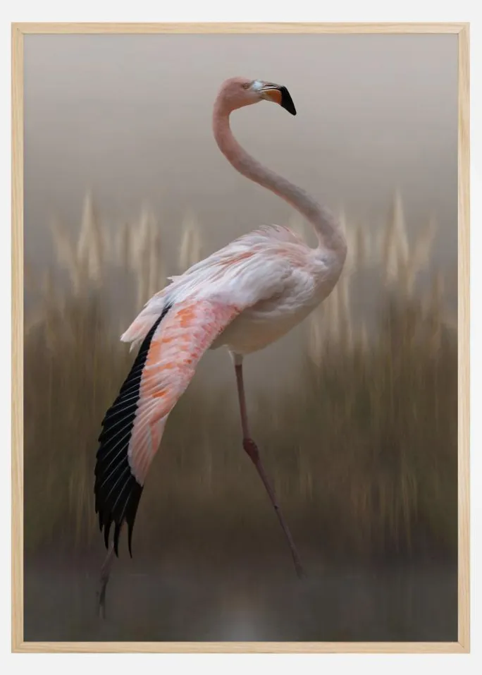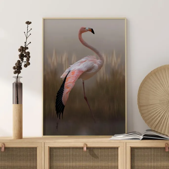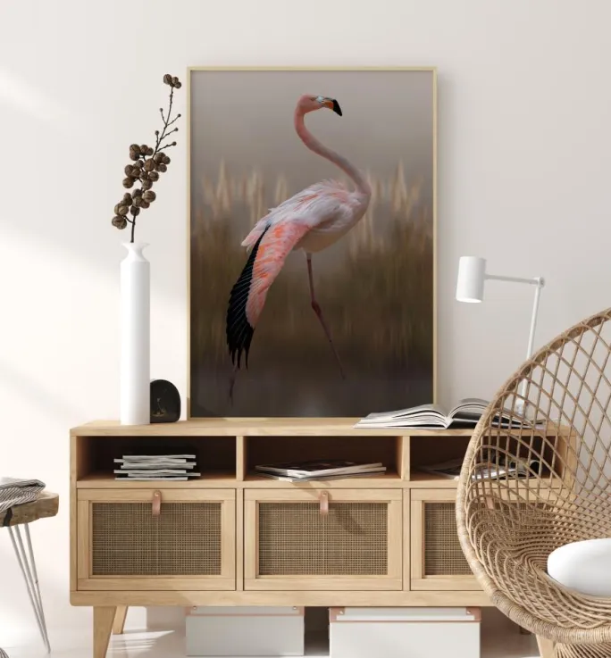 En vildtplakat med en lyserød flamingo. Tonerne og det slørede udtryk på dette billede giver det en fornemmelse af at være malet. Sammensæt billedet med en enkel blå baggrund og lad farverne springe i øjnene.