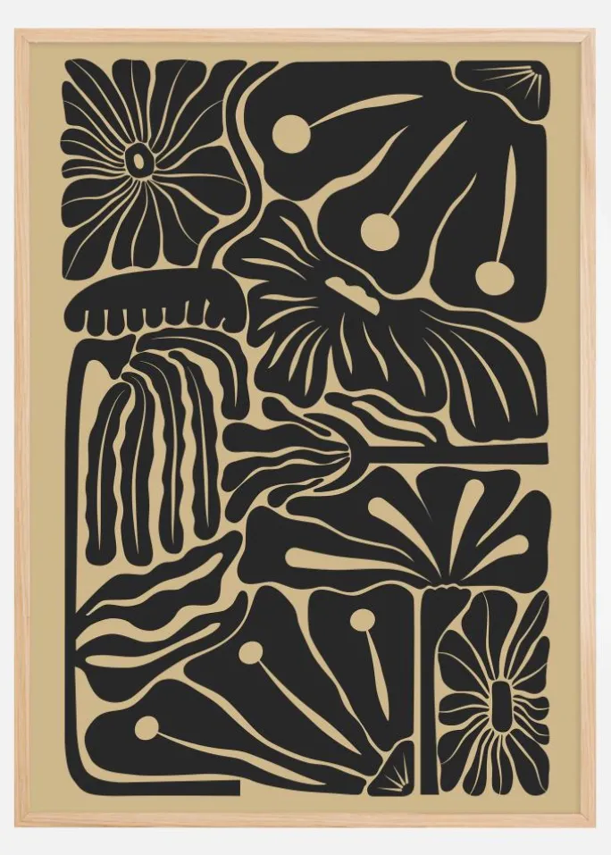 Denne stilrene plakat giver et moderne og minimalistisk indtryk, perfekt for den trendbevidste indretningsentusiast. Motivet viser en serie abstrakte former og linjer, der minder om blomster og blade i et organisk mønster. Den monokrome udførelse i dristige sorte detaljer på en beige baggrund skaber en stærk visuel kontrast, der fanger øjet. Et værk, der passer fremragende i en minimalistisk eller skandinavisk indretningsstil og tilføjer en følelse af natur uden at tage for meget plads visuelt.