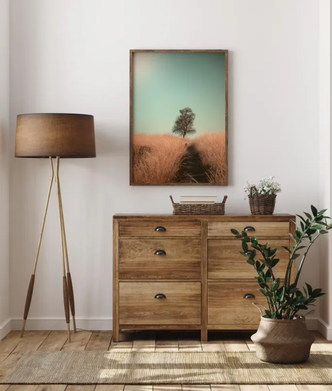 En naturlig landskabsplakat med en blød græsmark med en sti, der skærer sig igennem den mod et enkelt træ i horisonten. Den enkelte sti tager dig med på en rejse til det ensomme træ. Til venstre oplyser et blødt sollys scenen fra den lyseblå himmel.