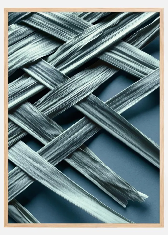 Denne samtidige plakat præsenterer et fascinerende og abstrakt motiv af krydsende linjer med en blød, blågrøn tone. Den minutiøst arrangerede komposition af linjer skaber et dynamisk mønster, der giver en følelse af bevægelse og tekstur, hvilket gør billedet både visuelt interessant og tankevækkende.