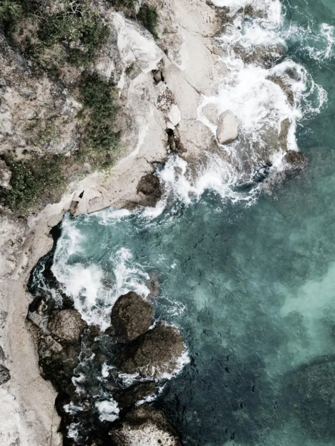En luftplakat af havet med bølgerne, der slår mod klipperne. Nyd skønheden i dette billede, mens du beundrer det krystalblå hav, der skyller mod de algeklædte klipper. Skønheden i dette billede giver dig næsten mulighed for at lugte friskheden i luften.