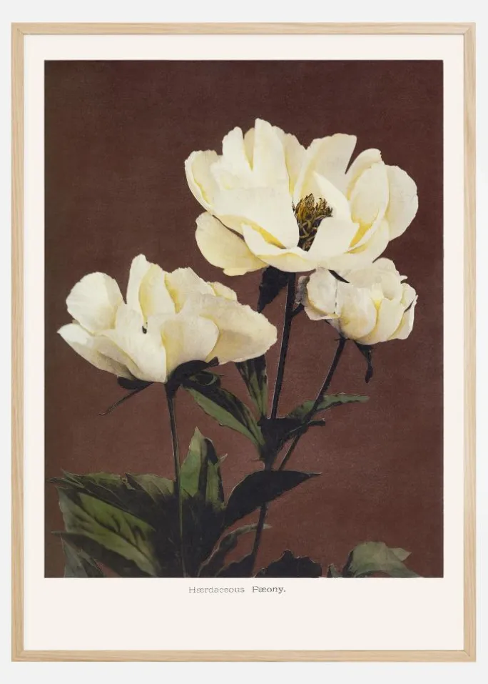 Denne kvalitetsplakat forestiller en malerisk skildring af en urtepion, en plante der er elsket for sin skønhed og elegance i haver verden over. De store, fyldige blomster i en blød palet af cremede og elfenbenshvide nuancer står i kontrast mod en rig, brun baggrund, der får dem til næsten at svæve frem på lærredet. Denne plantebaserede print fanger betragteren med sin detaljerede gengivelse af pions karakteristiske løv, hvor grønne nuancer varierer fra mørke til lyse toner, og skaber et livligt og naturtro indtryk.
