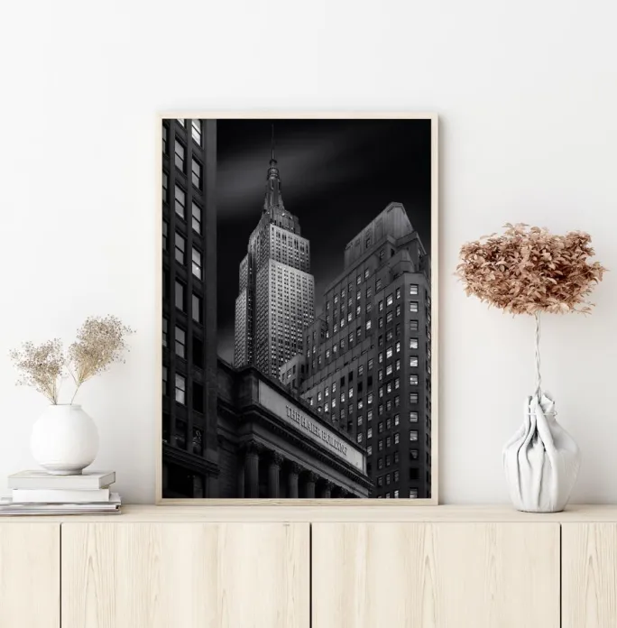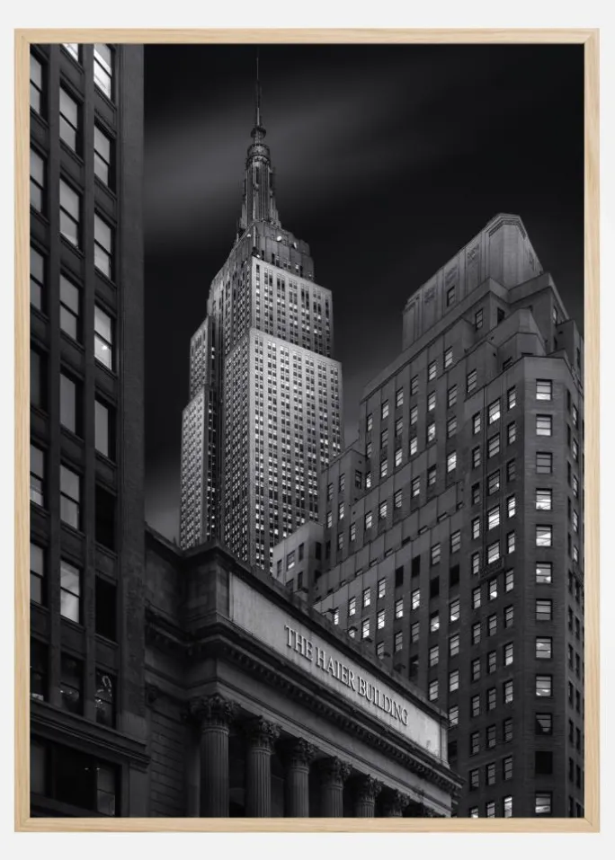 Et natportræt af Haier Building, New York. Bygningens lysende guldbogstaver i strålende lys staver The Haier Building. Med bygningerne mod en sort skyline er dette et meget fremtrædende billede. Dette dramatiske sort-hvid print af New York Citys skyline er perfekt på en bar hvid væg.