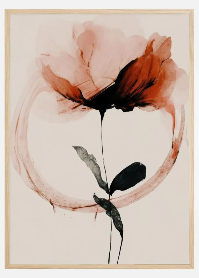 Oplev skønheden i vores abstrakte plakat, der viser en elegant, blomsterkomposition. I centrum står en stor blomst malet i bløde, svungne penselstrøg af varme røde og lyserøde nuancer, hvilket skaber en følelse af lethed og ynde. Kontrasten mod de dristige sorte linjer, der udgør stilken og løvværket, tilfører et moderne og sofistikeret udtryk, der fanger blikket og giver dybde til kunstværket.