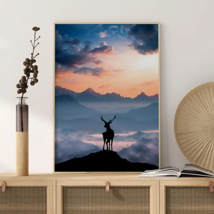 Et betagende landskabsprint med en smuk antilope i forgrunden. Antilopen sidder på en bakketop og kigger ud over de tågede bakker tidligt om morgenen. De smukke bløde farver hjælper dig med at værdsætte naturens magt. Skab en følelse af frihed, når du hænger dette print op i dit hjem.