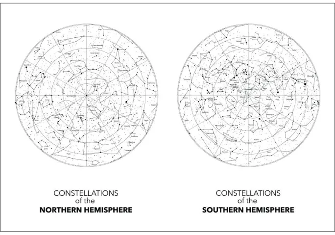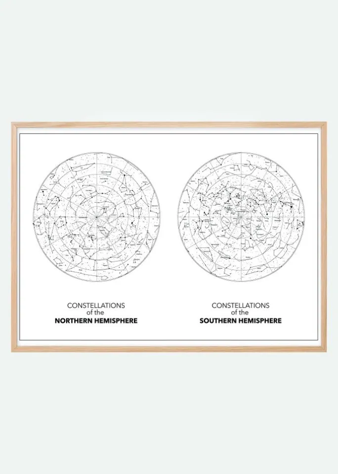 Et sort-hvidt print af den nordlige og sydlige halvkugle. På en hvid baggrund er stjernebillederne svagt skitseret i sort. Placeret side om side kan du beundre stjernernes mystik. Hæng dette print op i dit arbejdsværelse og skab en følelse af uendelighed.